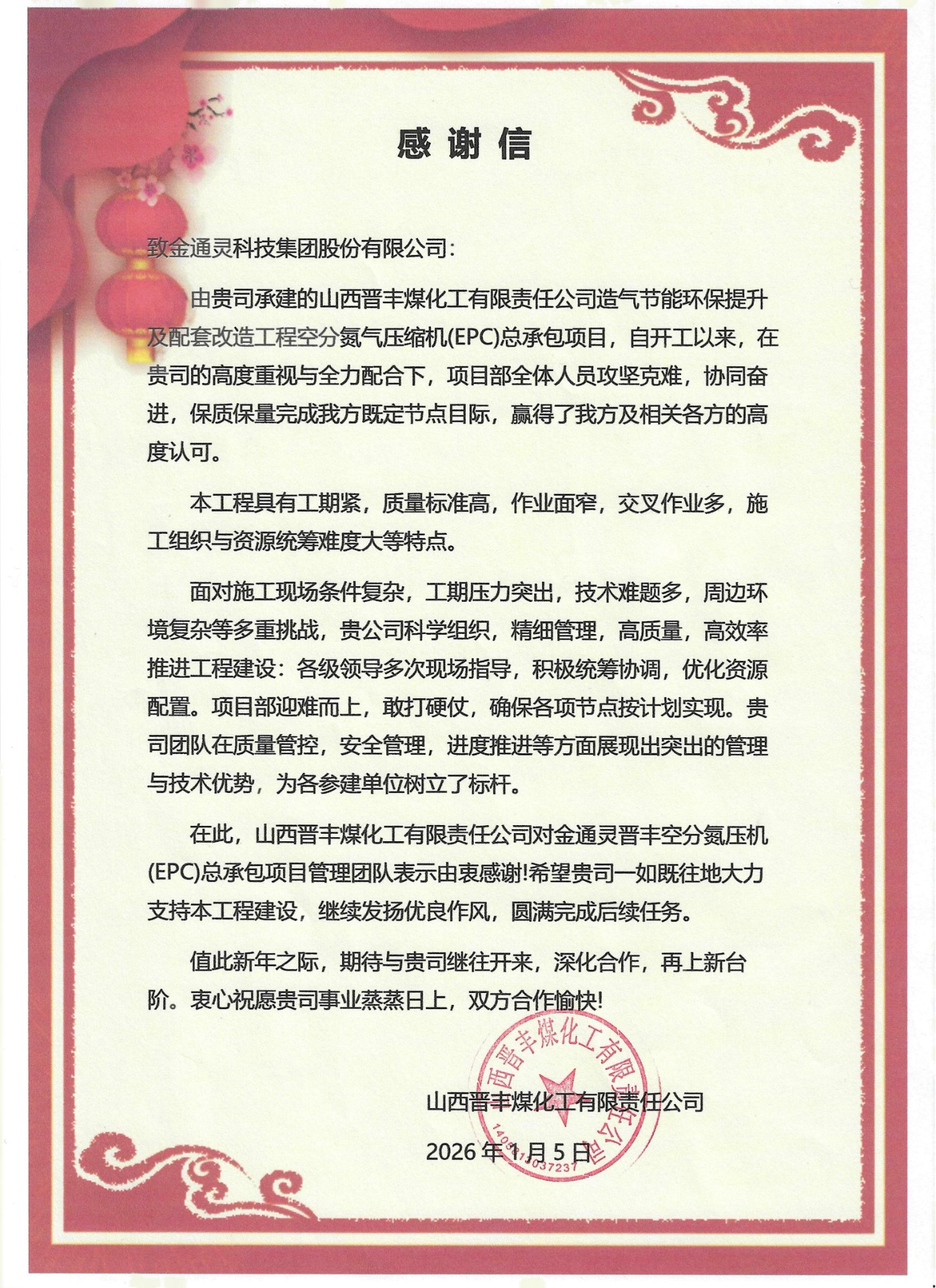 1月13日,金通灵公司收到山西晋丰煤化工有限责任公司的一封感谢信,信中对公司承建的…