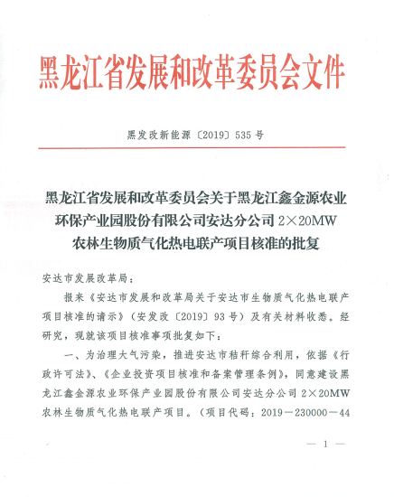 近日,黑龙江省发改委发布了《黑龙江省发展和改革委员会关于黑龙江鑫金源农业环保产业园股份有限公司安达分公司2×20MW农林生物质气化热电联产项目核准的批复》(黑发改新能源【2019】535号),安达2×20MW农林生物质气化热电联产项目通过核准。目前黑龙江鑫金源农业环保产业园股份有限公司安达分公司已与升平镇和火石山乡签约建设秸秆收储压块站,热电联产项目也落座安达市万宝山精细化学品产业园区。