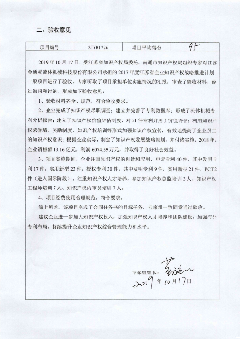2019年10月17日,根据《省知识产权局关于开展省企业知识产权战略推进计划2017年立项项目验收的通知》和《江苏省知识产权创造与运用专项资金管理实施细则》要求,公司参加了南通市知识产权局组织的项目验收答辩会,通过项目实情况汇报、验收材料审查及专家现场提问,验收专家组根据项目实施情况进行评分,并现场出具验收意见。项目完成了合同任务书的目标任务,获得95分高分,专家一致同意通过验收。